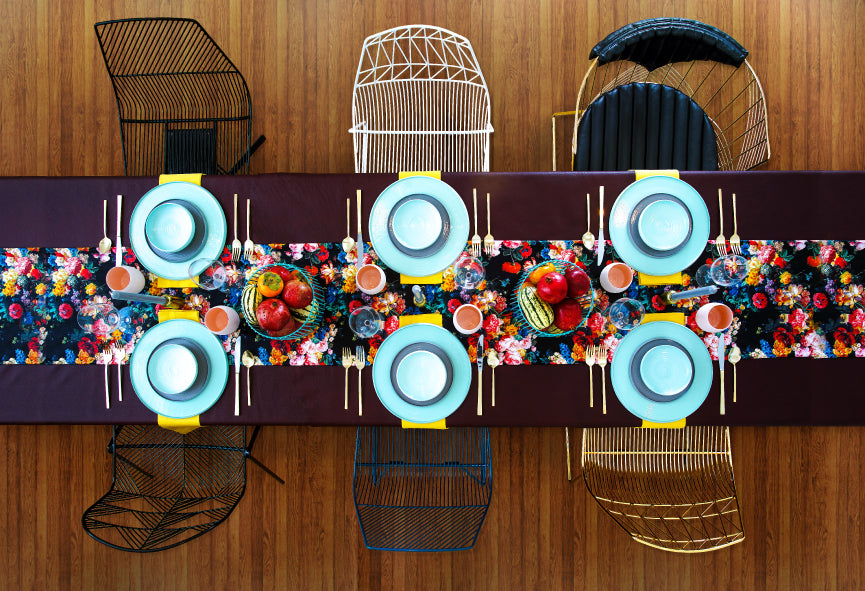 When you think of a typical Thanksgiving tablescape it almost always involves pumpkins, napkins tied with twine, and a color scheme that is more bland than a stale bagel. To say it nicely: we are over that Pinterest driven aesthetic. The #bendsgiving tablescape is based on our love of bold, unapologetic color and retro aesthetics. When deciding on a color palette we wanted to incorporate autumnal colors like maroon and umber alongside bright pops of aqua, pink, and yellow. Bringing in a loud floral print textile as a table runner helped to make the table feel less serious and more funky. Last but not least, we used our Mini Baskets in Aqua to create the perfect center pieces filled with Pomegranates, Persimmons, and Squash (for a seasonal touch) and a mix of Bend chairs for seating (duh.)