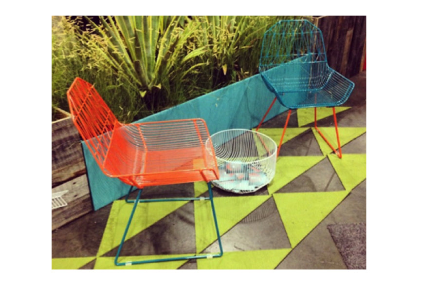 eaving the typical trade show booth set up and heading into to the outdoor area of Dwell on Design was definitely the right move. The atmosphere was really fun and energetic! We ended up behind a prefab by a company called Wheel Haus. The reclaimed wood styling of their modular cabin made for the perfect back-drop for our bright and colorful wire chairs. They even took a couple Peacock Lucy Chairs and put them on the front porch and let us hang a white Gazelle on the back wall. We also decided to make a really fun 3D sign out of our logo which made a really great design statement. As for our goods, we swapped in some orange Counter and Bar Stools and switched the legs on two of our Farmhouses to give them a whole new look. The Copper Lucy, Captain chair and the baskets were definitely the big hits out of the show. Listening to the plans that people have for our baskets is always fun. Our customers always come up with the most creative ways to use our products and we absolutely love it!