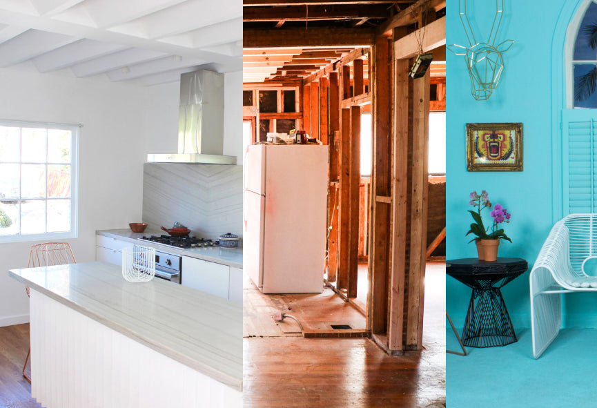 In February, the demo began. We wanted to keep the layout and the original bones of the house in place but give it a good modern update. Some walls were removed and other just slightly adjusted. There were some crazy built ins that flanked the fireplace in the living room that were replaced with secret doors which when opened completely changed the space. The once dark house also got some amazing skylights, allowing the California sunlight to flow freely. We also took some fun design risks that really lend themselves to the Pointy namesake. In the end, what we started with was a pretty dark and depressing space that is now bright, inspiring, and most of all welcoming.