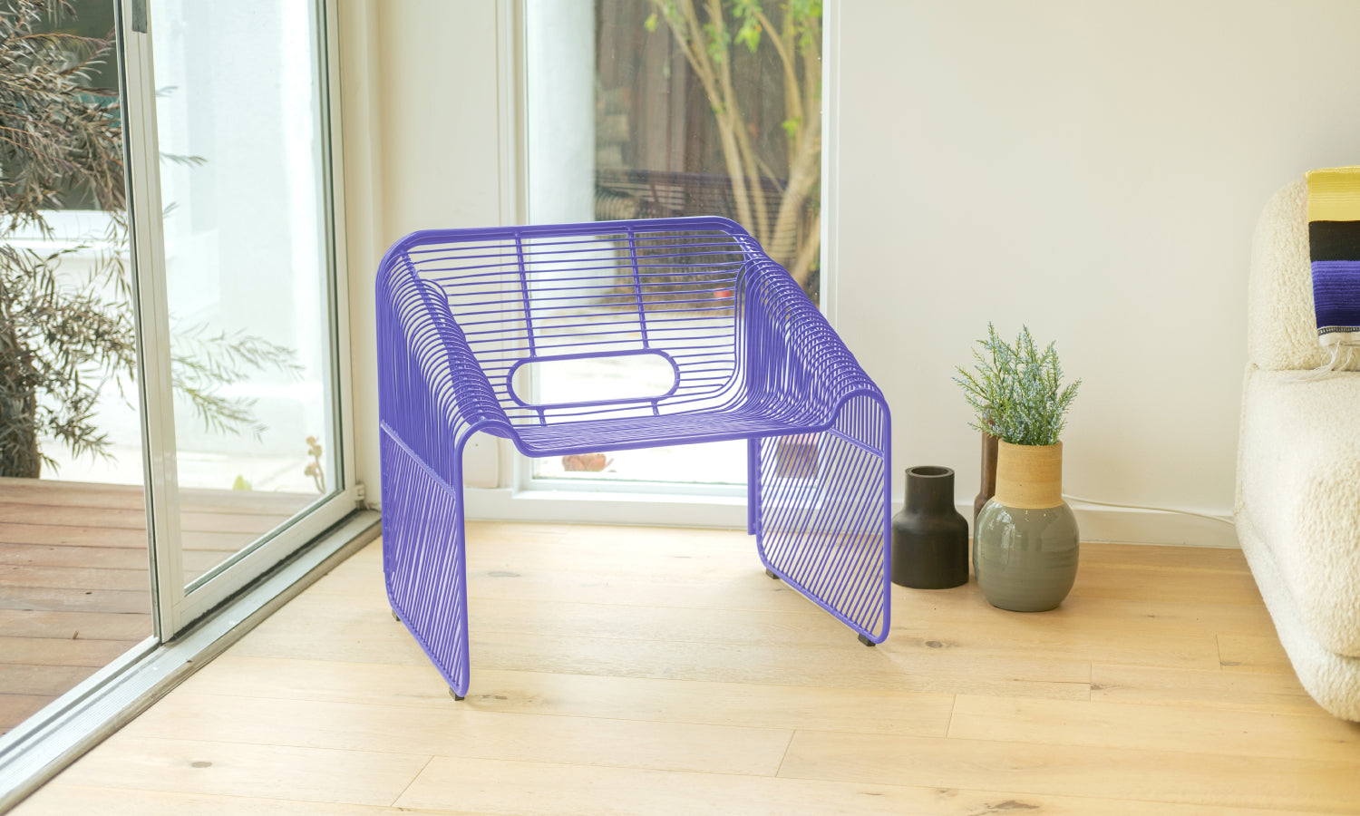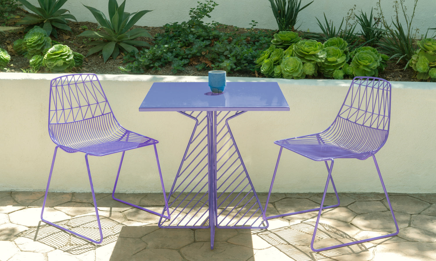 We couldn't help but be inspired by this year's Pantone color so we've put together a few images of our own wire furniture designs sporting the new Very Peri. Check out our custom color patio set, the Lucy Stacking Chairs and the Cafe Table! This set is the perfect size for a California bungalow style home or multiple sets for outdoor dining areas. We couldn't help ourselves and also added Very Peri to one of our lounge chair designs, the Hot Seat. She's looking very stylish in this color, a powerful representaion of feminism.