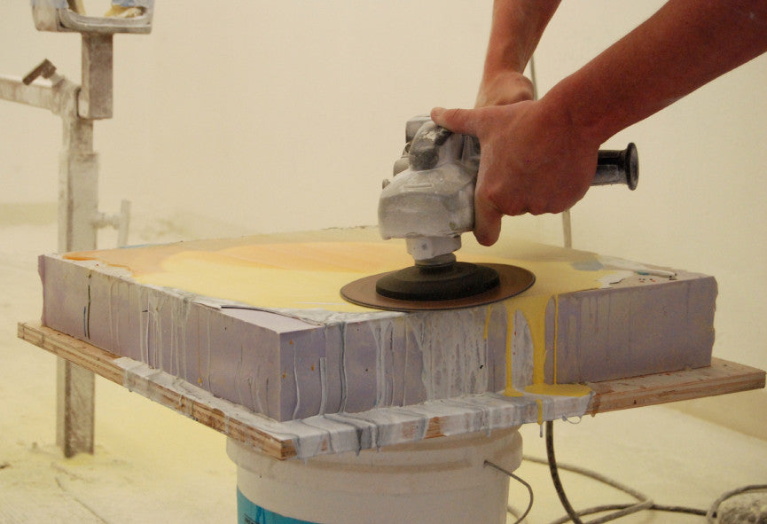 Crafting surfboard resin requires a lot of technical skill to produce a beautiful finished product. The multistep process begins with pouring the leftover resin used to make Wax Surf Co.’s surfboard into a specially shaped mold. After the resin sets, the technician begins by sanding down the resin until the excess is eliminated. Watching the tabletop slowly appear from under the layers of dusty resin was like watching someone uncover a precious artifact. As each layer of dust was removed and the excess resin covered our clothes we began to see the brilliant and unexpected marbleized pattern appear.